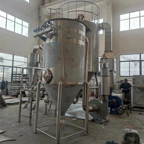 After filtering and heating, the air enters the air distributor on the top of the dryer, and the hot air enters the drying chamber evenly in a spiral shape. The material liquid passes through the high-speed centrifugal atomizer at the top of the tower, and (rotating) sprays into very fine misty liquid beads, which can be dried into finished products in a very short time in co-current contact with hot air. The finished product is continuously output from the bottom of the drying tower and the cyclone separator, and the exhaust gas is evacuated by the fan.